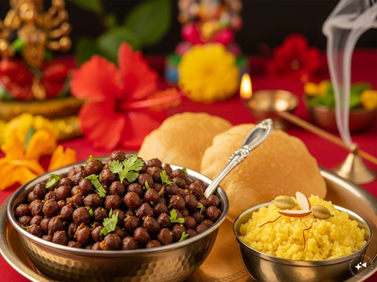 The Significance of *Kale Chane* on Durga Ashtami: *Kale Chane* are regarded as a symbol of strength and simplicity. Simple yet highly nutritious, they are an integral part of the *Bhog* offering. They are also specifically served during *Kanya Pujan*, as they constitute a *Sattvic* (pure and wholesome) meal, prepared without the use of onions or garlic.