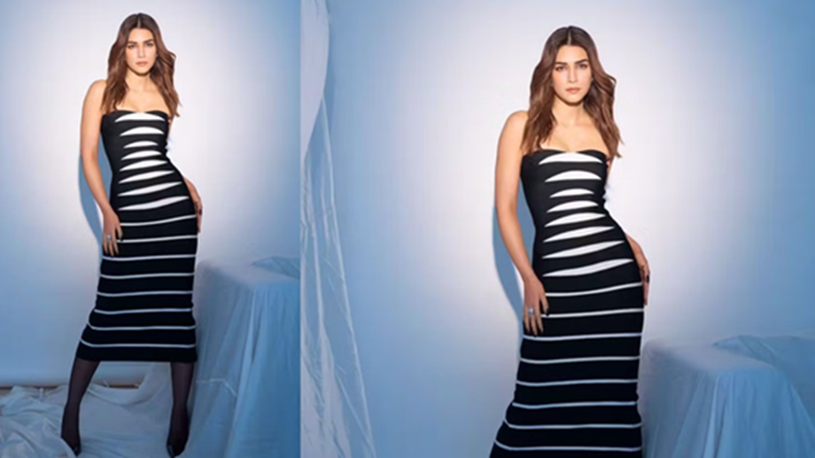 If you want to make your look glamorous and boss-lady-like, then take tips from Kriti Sanon's look. You can dazzle everyone by wearing a black and white off-shoulder dress like this. Wear fleece leggings with it. This will protect you from the cold, and your look will also be quite unique. Wear boots with this look.