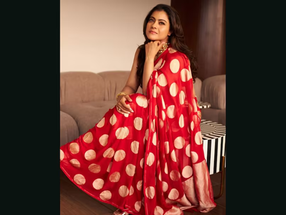 The third look is in a red saree, which reflects Kajol's style sense. The golden polka dots on the red saree make it both traditional and fashionable. Her open hair and minimal makeup make it even more graceful. This look is perfect for those looking to make a Durga Puja evening special.
