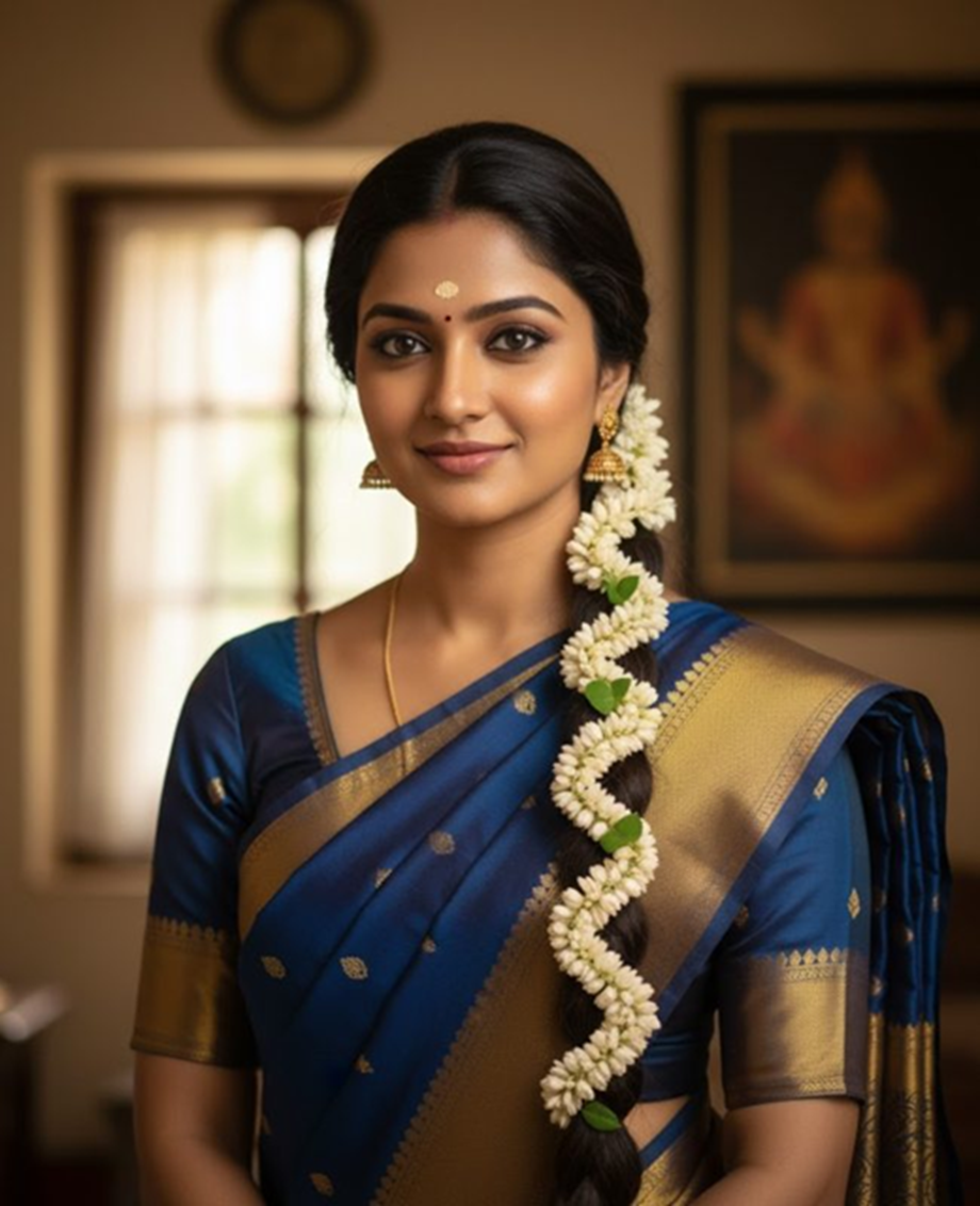 A long braid with a gajra can create a truly elegant and ethnic look. This style looks especially beautiful with a South Indian saree.