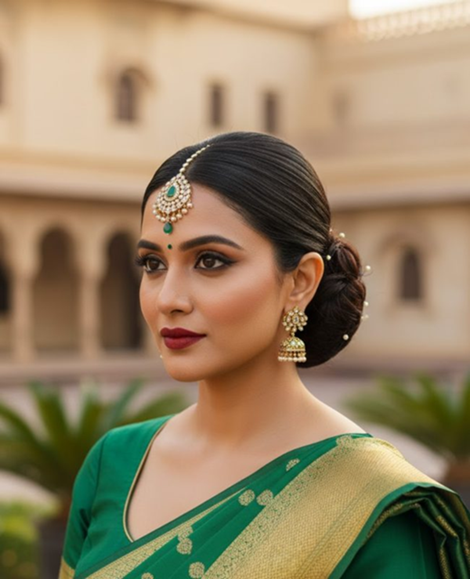 A low bun with a traditional maang tikka can enhance a bridal or festive look. This hairstyle pairs perfectly with traditional jewelry.