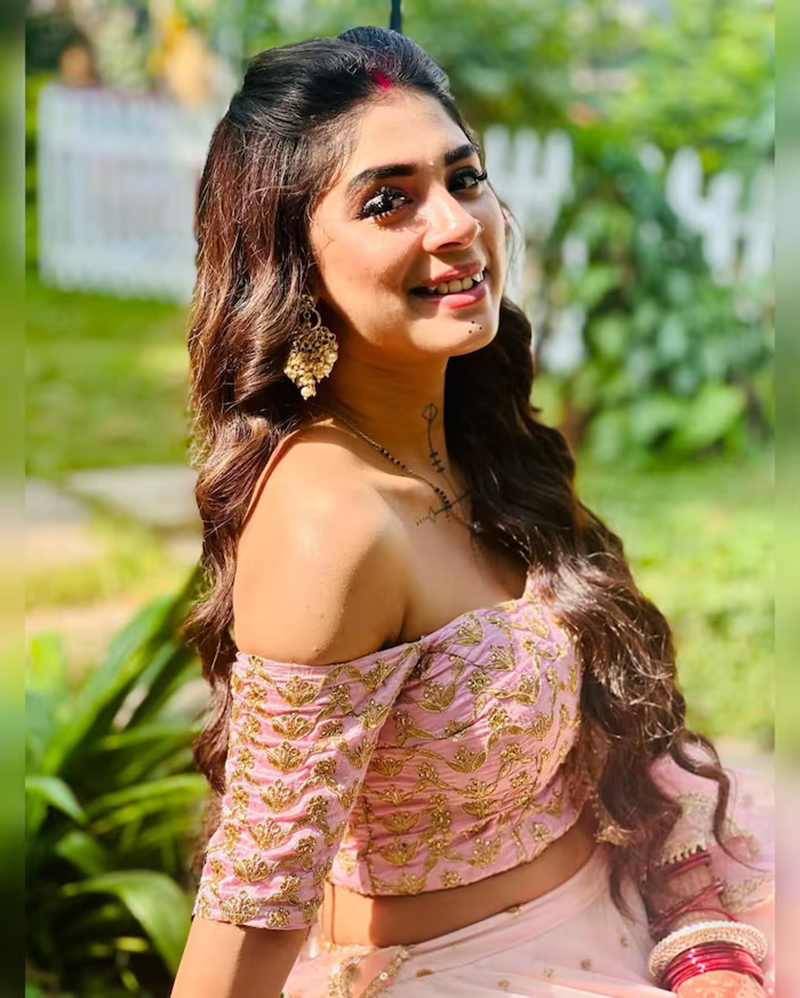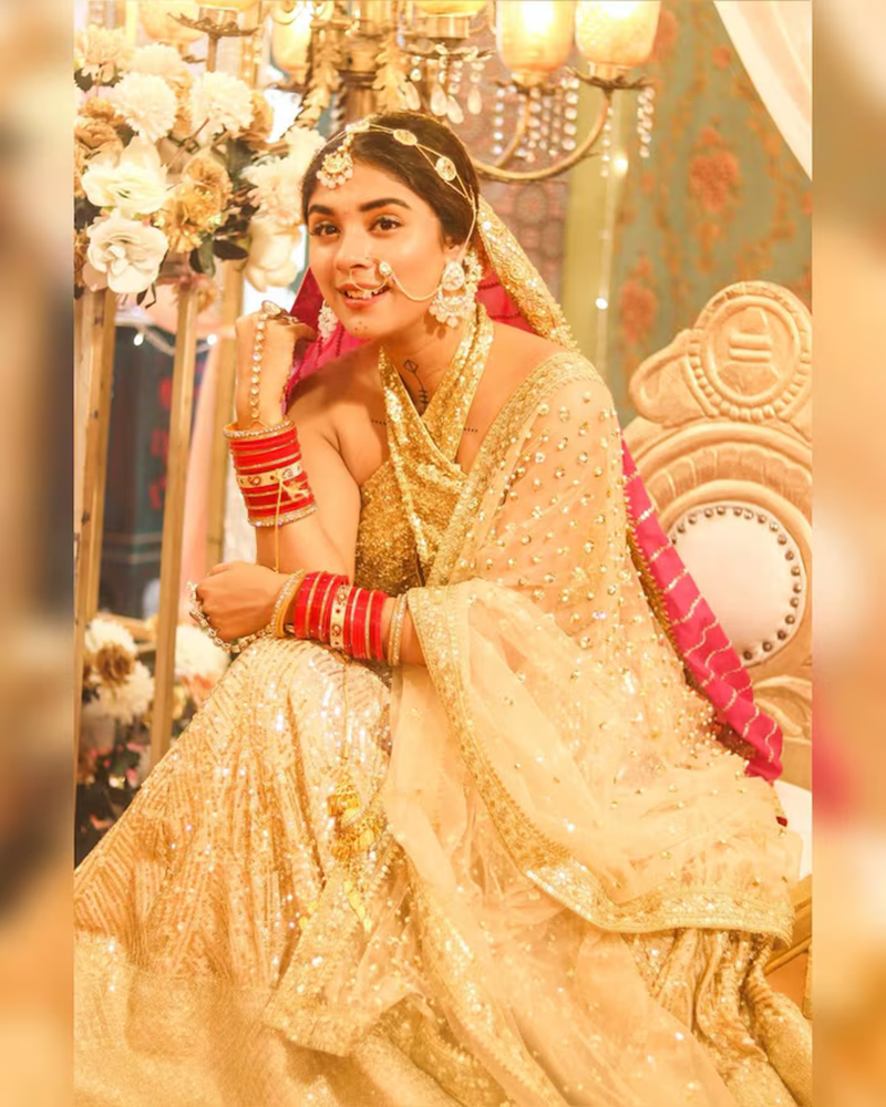 Adrija's look in blush pink off-shoulder blouse looks royal as well as very trendy. It has golden embroidery detailing, which makes it elegant and festive-ready. Its fitting and off-shoulder style make it a perfect choice for a modern bridal and party wear look.