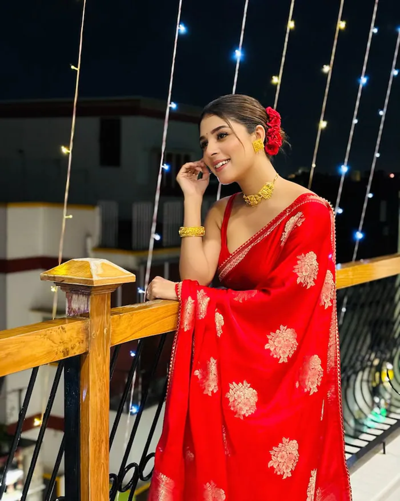 Adrija wore a red colored sleeveless and deep neck blouse with a red saree, in which she looked very elegant and graceful. The simple and classic cut is perfectly matching with the traditional saree. It can be a great choice for festive and wedding functions.