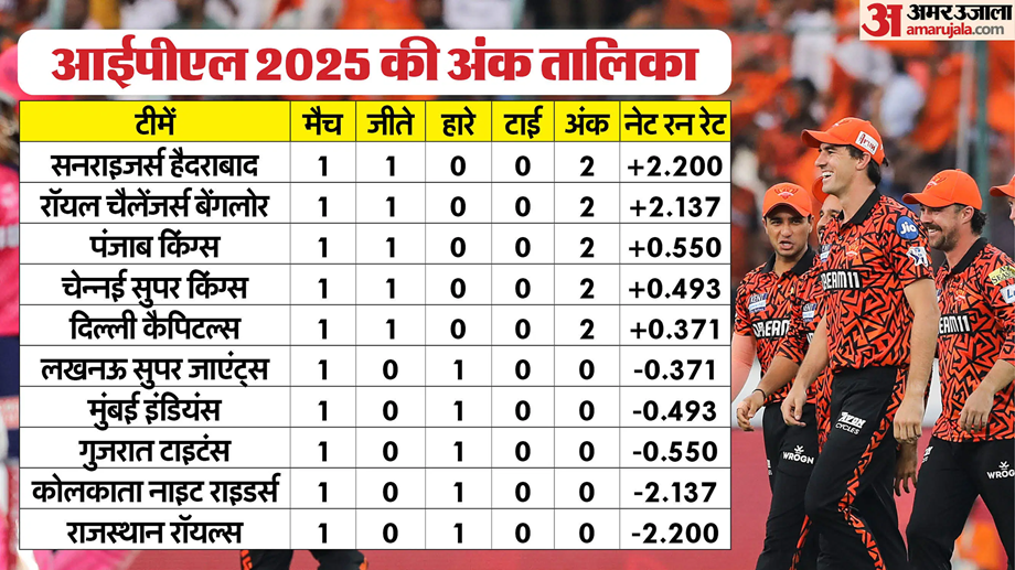 TATA IPL 2025 Points Table: IPL 2025 has started with a bang and all the teams have played one match each in the group stage. The 18th season of the IPL started with a match between defending champions Kolkata Knight Riders (KKR) and Royal Challengers Bangalore (RCB) on March 22. At the same time, the last match of the first round was played between Gujarat Titans and Punjab Kings on Tuesday. After all the teams played one match each, last time's runner-up Sunrisers Hyderabad had the upper hand in the points table and the team was at the top.