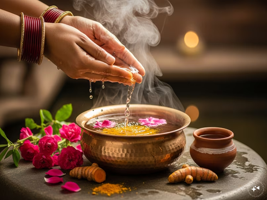 6. Pay attention to the water temperature and bathing materials: The materials used for bathing also matter. The water should not be too cold or too hot; slightly lukewarm water is considered better. Adjust the temperature according to the weather. Avoid very fragrant soaps or chemical-laden products. Adding a few drops of turmeric, Ganges water, or rose water is considered auspicious.