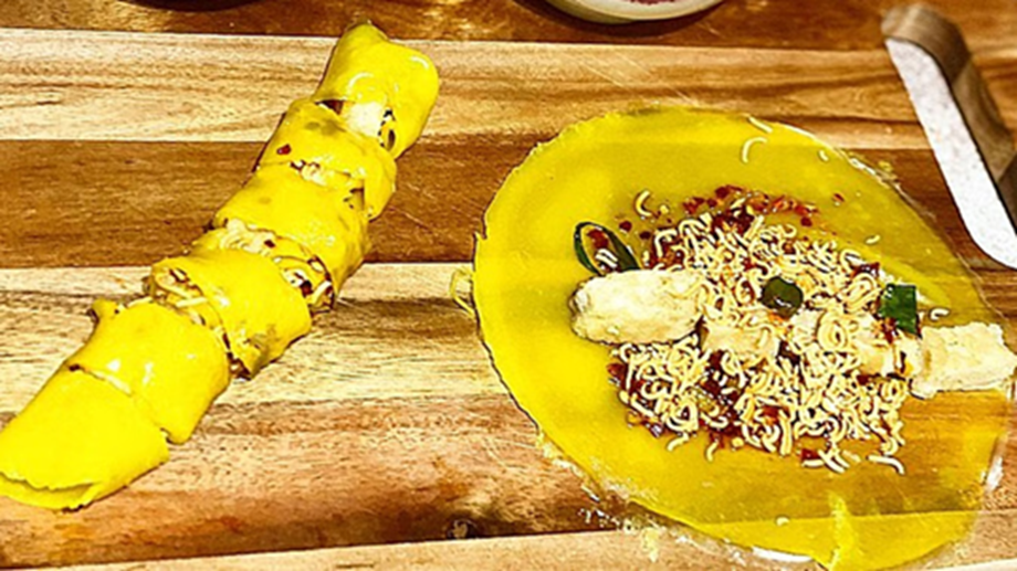 Now we have to prepare the laughing roll. So, for that, place the laffing sheet on a chopping board and spread the masala in it. After applying the masala completely, put Wai-Wai noodles in it and then roll the laffing. After rolling, cut it into small pieces and then serve. It is tasty as well as spicy to eat.