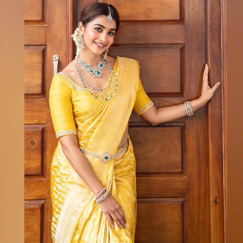 Pooja Hegde is wearing a yellow color Kanjeevaram silk saree. The actress is looking very beautiful in it. Also, the look has been completed with a diamond style heavy jewelry and bun hairstyle. New brides can recreate this look of the actress.