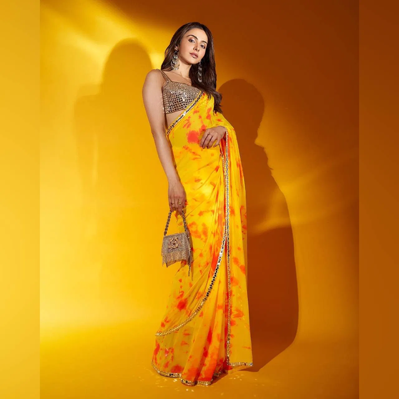 Rakul Preet is wearing a yellow color tie and a dye handmade saree in georgette. Mirror and embroidery work has been done on the borders of the saree as well as on the blouse. She has also carried heavy earrings. This kind of lightweight saree is perfect and comfortable for every special occasion.