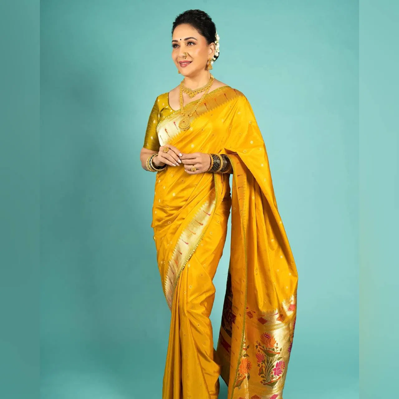 Madhuri Dixit is looking very beautiful in this yellow color Banarasi saree. Also, the look has been completed with contrasting green color bangles, heavy jewelry, and bun hairstyle. You can also take ideas from this look of the actress.