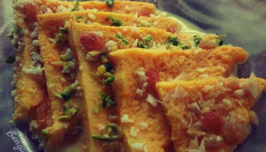 - Now take already fried bread slices and coat them with sugar syrup by brushing it. After this, arrange all the bread slices in a serving plate.