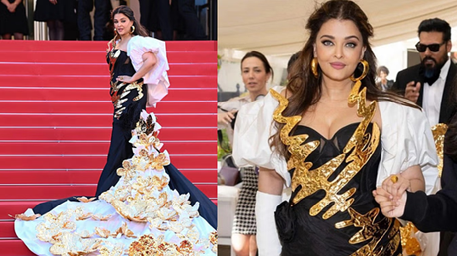 This dress of Aishwarya Rai Bachchan was given a metallic 3D elements look by the team of designers Falguni and Shane Peacock, which looked amazing. She had attached puff sleeves to this dress, which looked very different and unique. Talking about the specialty of Aishwarya's dress, the long trail on her dress was attracting everyone's attention, due to which her style looked even more cute. Black, white, and golden colors were used to prepare this dress.