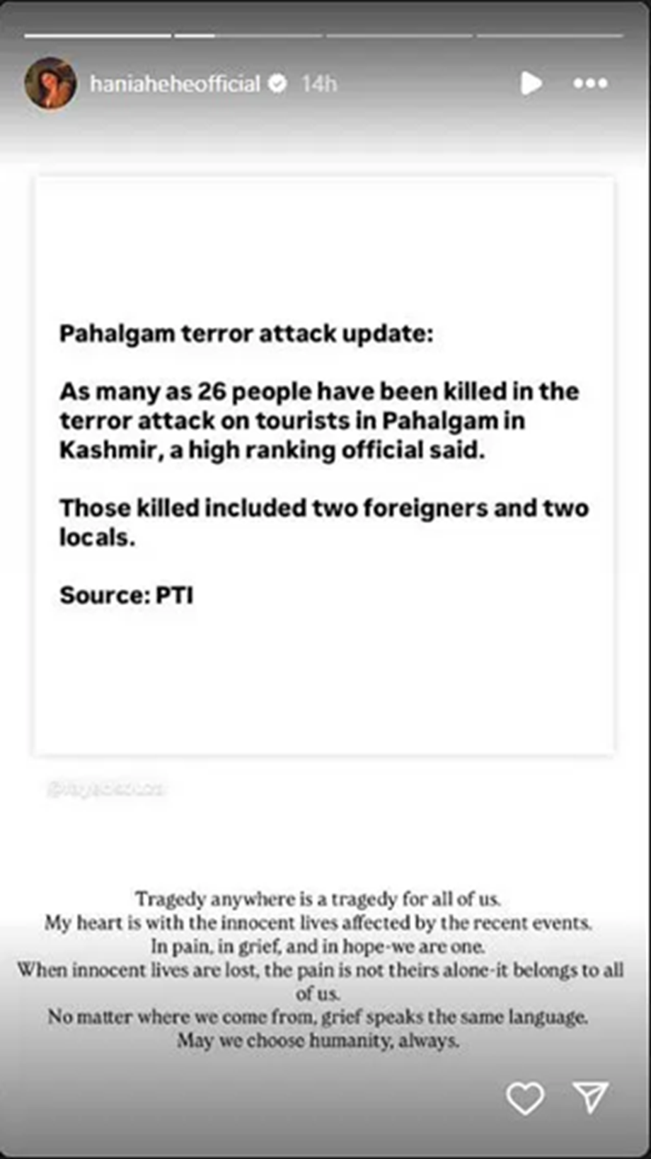 Hania Aamir took the help of social media to react to this accident. The actress has shared a story related to this incident on her Instagram. In this story, she wrote, “A tragedy anywhere is a tragedy for all of us. My condolences to the innocent people affected by the recent events. In pain, in sorrow, and hope - we are one. When innocent people die, the pain is not just theirs, it is for all of us. No matter where we are from, grief speaks the same language. We must always choose humanity.” Hania is the first Pakistani celebrity to express grief over this incident.
