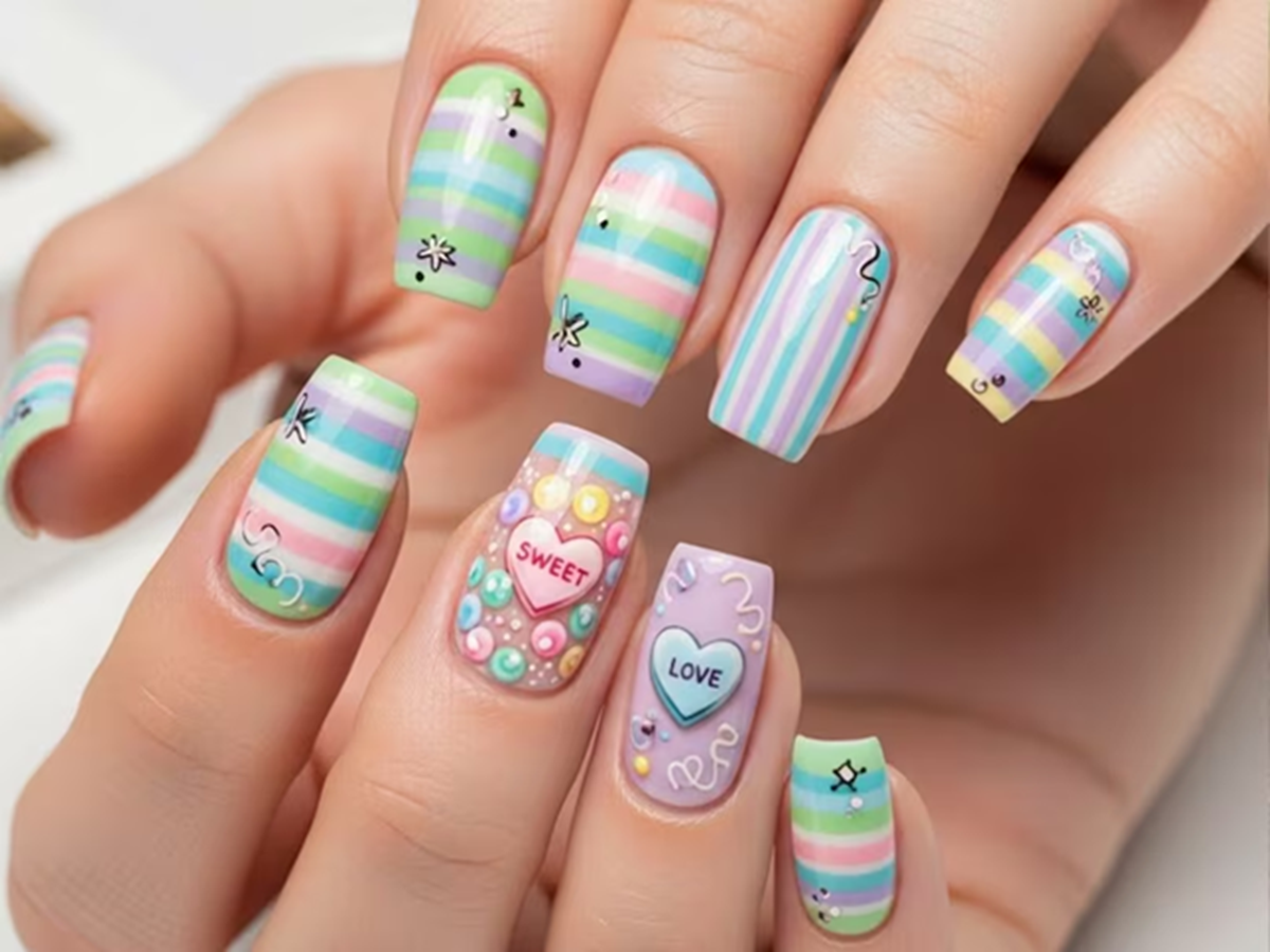 Candy Nails - Think pastel-colored lines, candy hearts, and playful designs. This design is adorable and fun, ideal for anyone who wants their nails to feel like a Valentine's Day candy box.