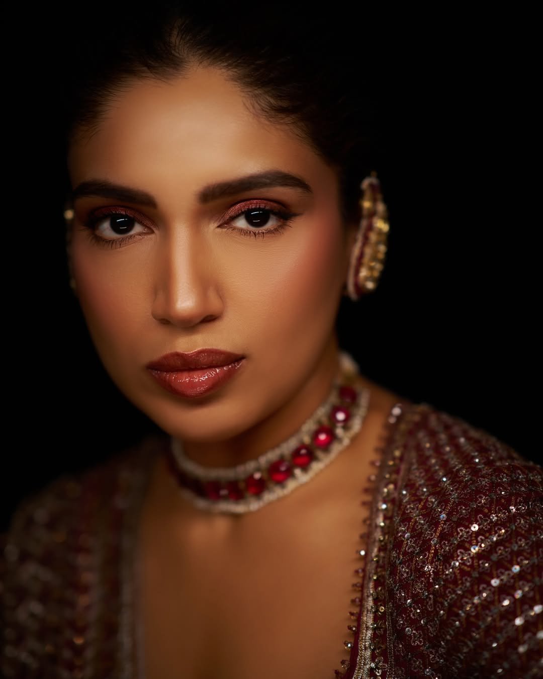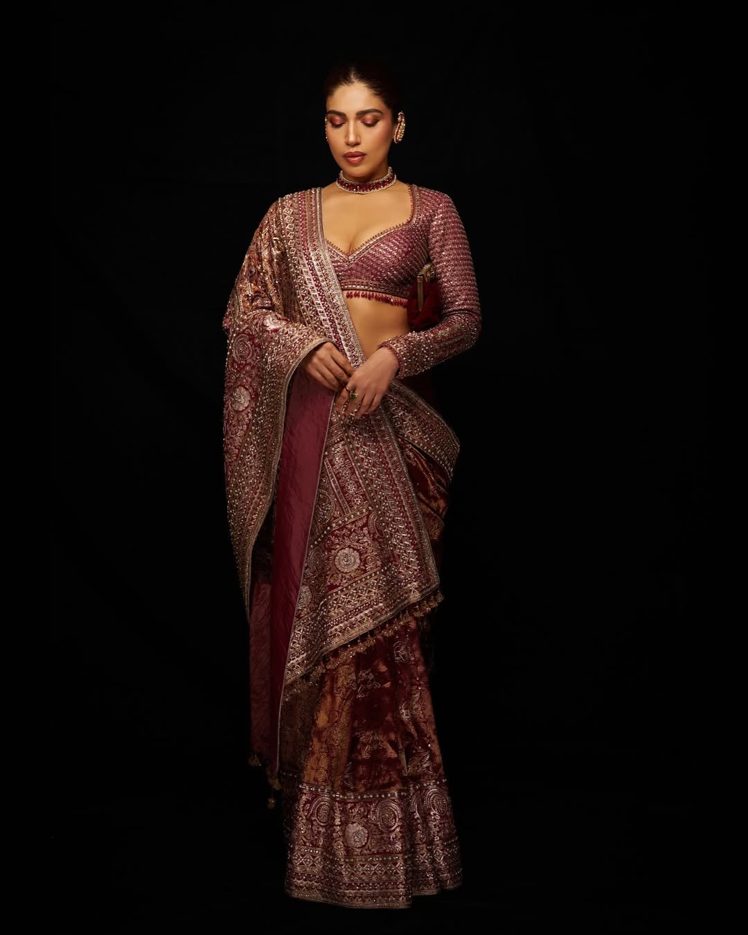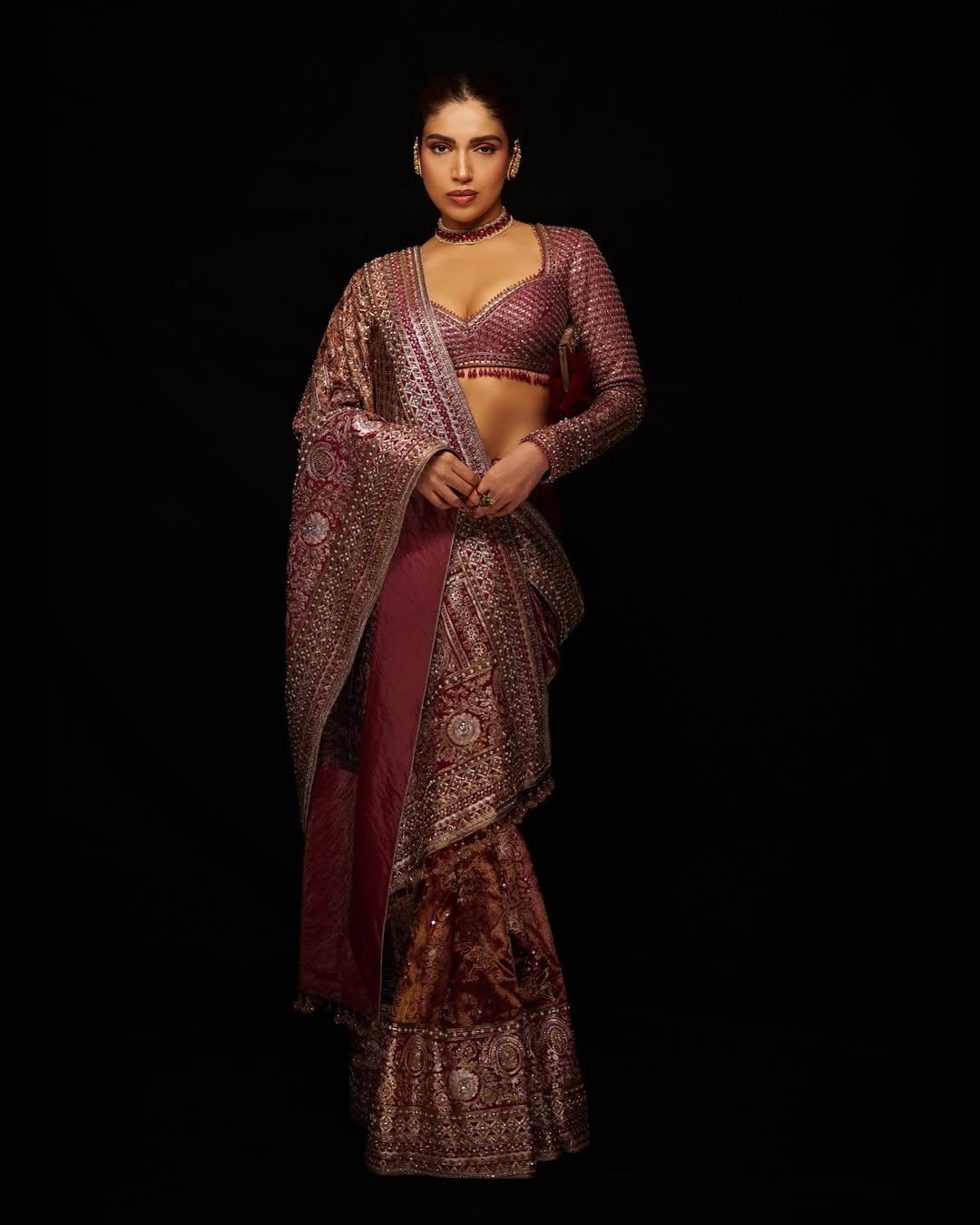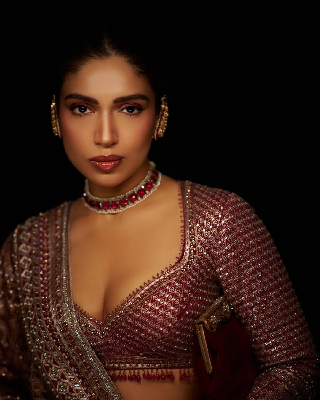 Bhumi completed her look with matching jewelry and a bun.