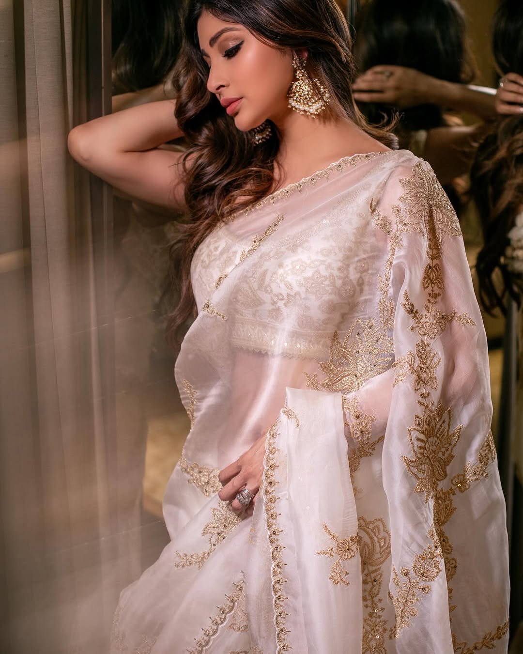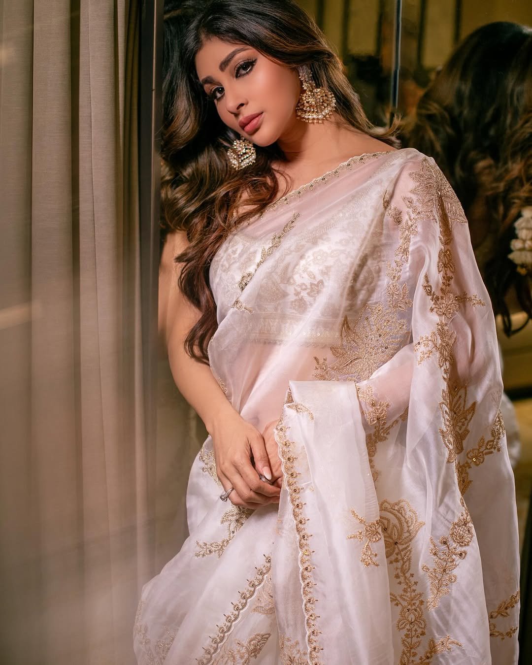 In one picture, Mouni Roy is also flaunting her earrings with her saree.