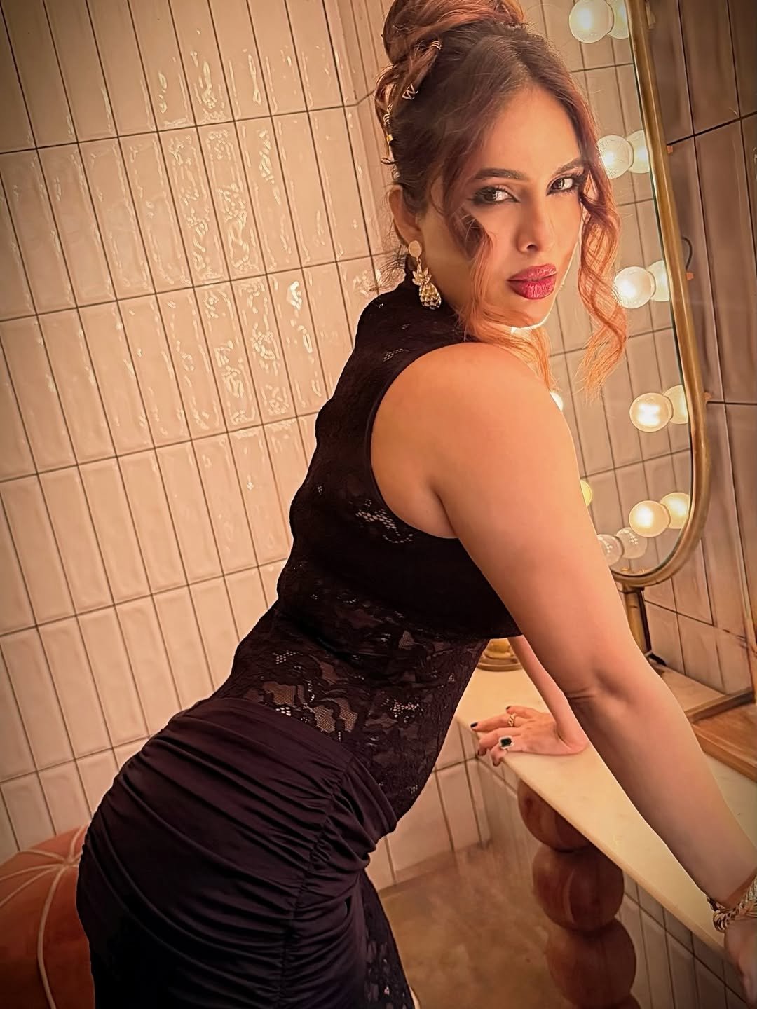 In this new look, Neha is seen striking sizzling poses in a black thigh-slit gown.