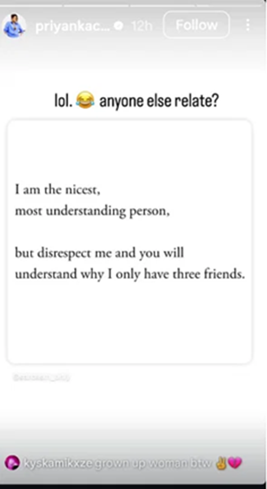 Priyanka Chopra recently shared a note on her Instagram story, in which she wrote, 'She is a very good and sensible person until someone disrespects her. If someone disrespects her, then it will be understood why she has only three friends.' She jokingly wrote with this post, "Haha, does anyone else even care about this?"