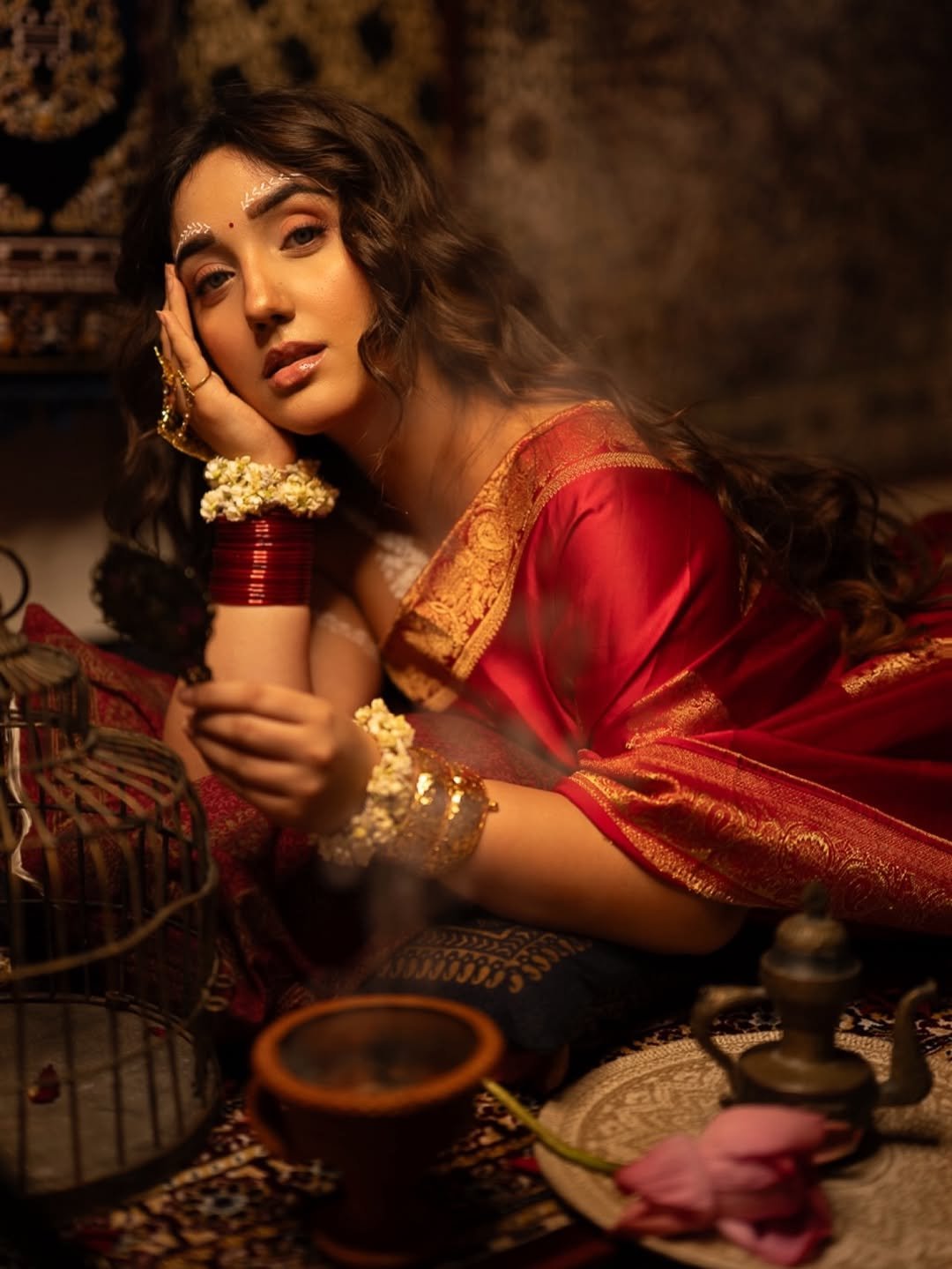 In the photos, Ashnoor was seen wearing a red saree, a small bindi on her forehead, and red bangles on her hands.