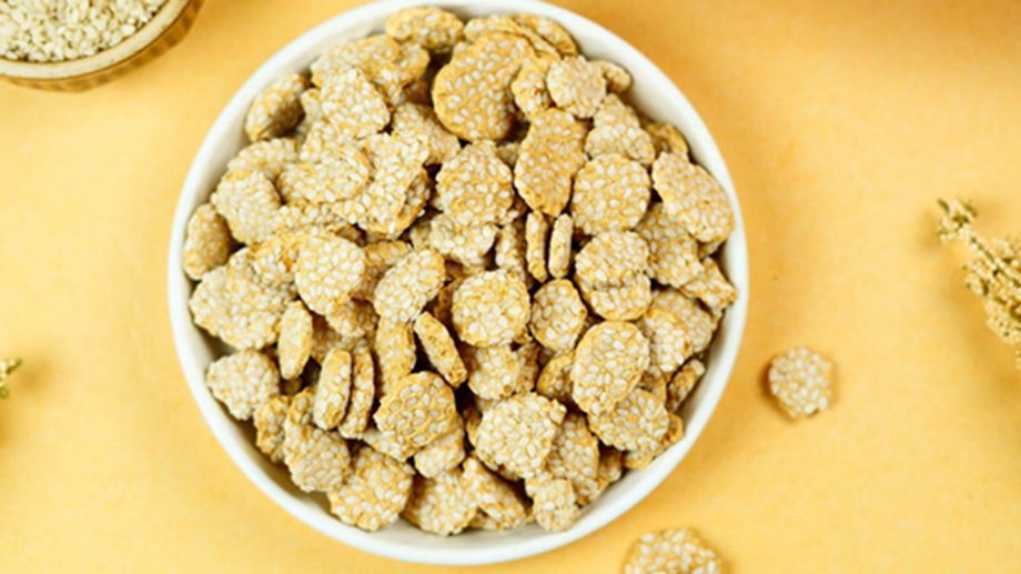 To make rewari at home, first, put the sesame seeds in a pan and roast them lightly over low heat. Remove them from the heat when they become fragrant and turn a light golden color. Roasting the sesame seeds properly makes the rewari crispy.
