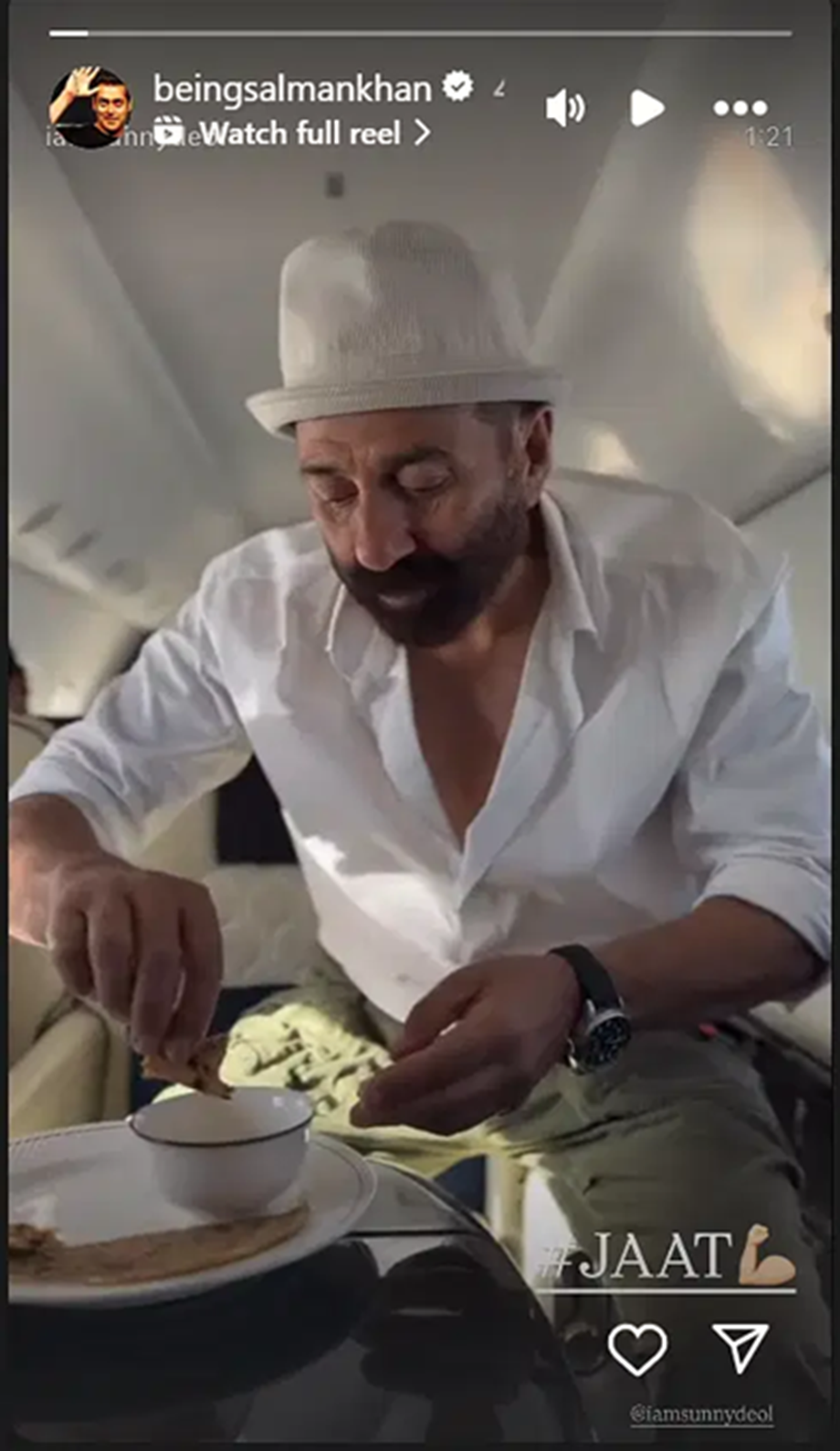 Sunny Deol recently shared a video of himself on his Instagram account. In this, he was seen eating food in flight. He wrote a caption with it, 'Apna style hai desi. Parantha dahi aur lassi. Thank you all for showering so much love on the theme song of 'Jaat''. Salman Khan has shared this video of Sunny Deol on his Instagram story today on Thursday. Tagging Sunny Deol with it, he has written, 'Jaat'.