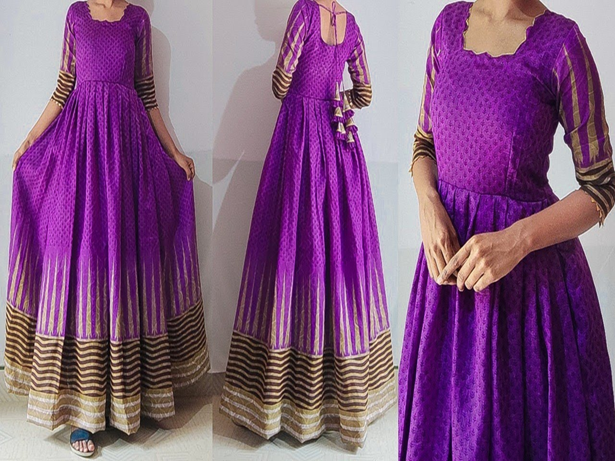 The first and latest design is the Angrakha-style maxi dress. You can make it from an old red or dark-colored plain handloom saree. It features an overlapping front cut, tied with long cords and beautiful tassels on the side. This design is not only comfortable to wear but also gives you a stunning ethnic look.