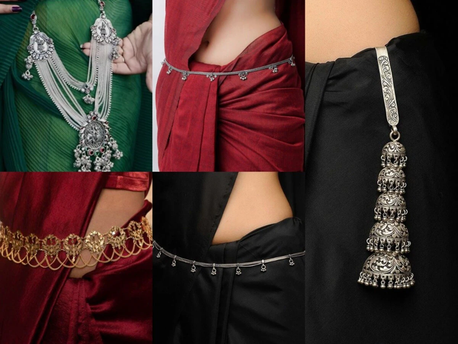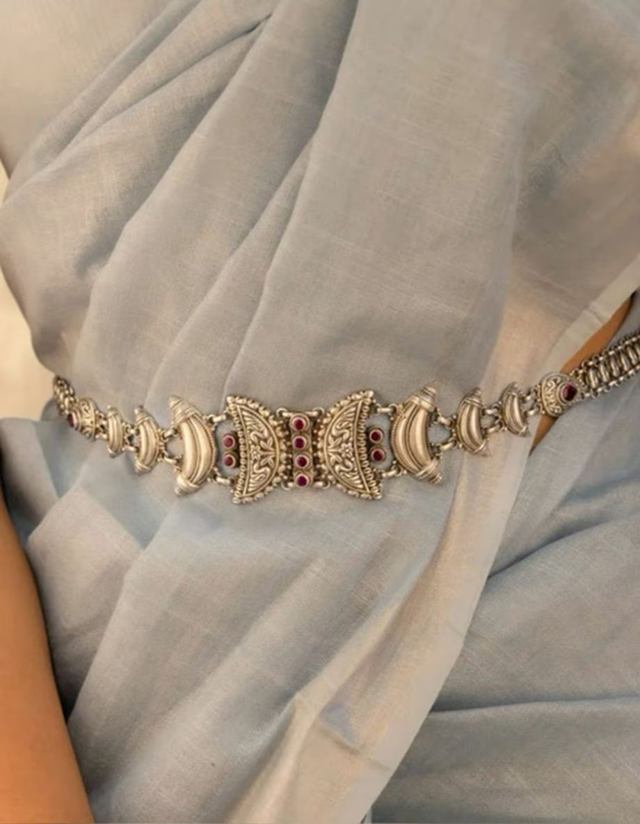 These days, a variety of silver kamarbandh designs are available in the market—floral patterns, kundi work, temple designs, pearl-studded kamarbandhs, oxidized finishes, and antique styles. Belts with floral and minimalist designs are especially popular with modern bahus as they complement every outfit. Intricately carved and embroidered kamarbandhs are perfect for weddings or grand functions.