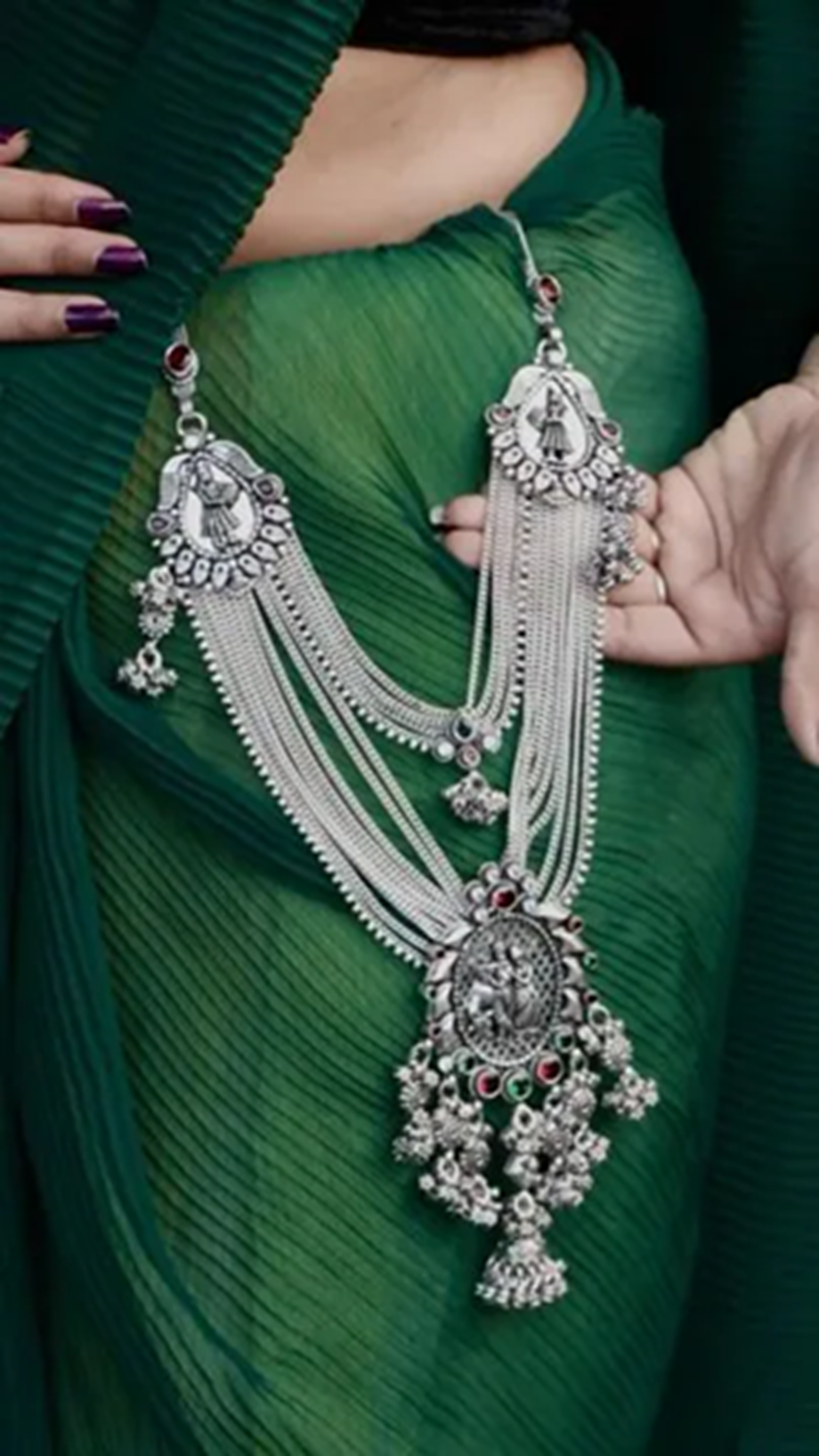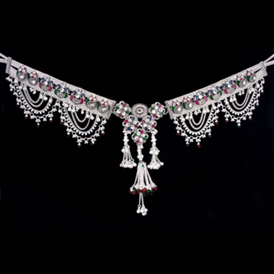 One of the great advantages of a silver kamarbandh is that it looks great on any skin tone. While gold jewelry can sometimes seem overwhelming, depending on the outfit or skin tone, a silver kamarbandh instantly adds glamour.