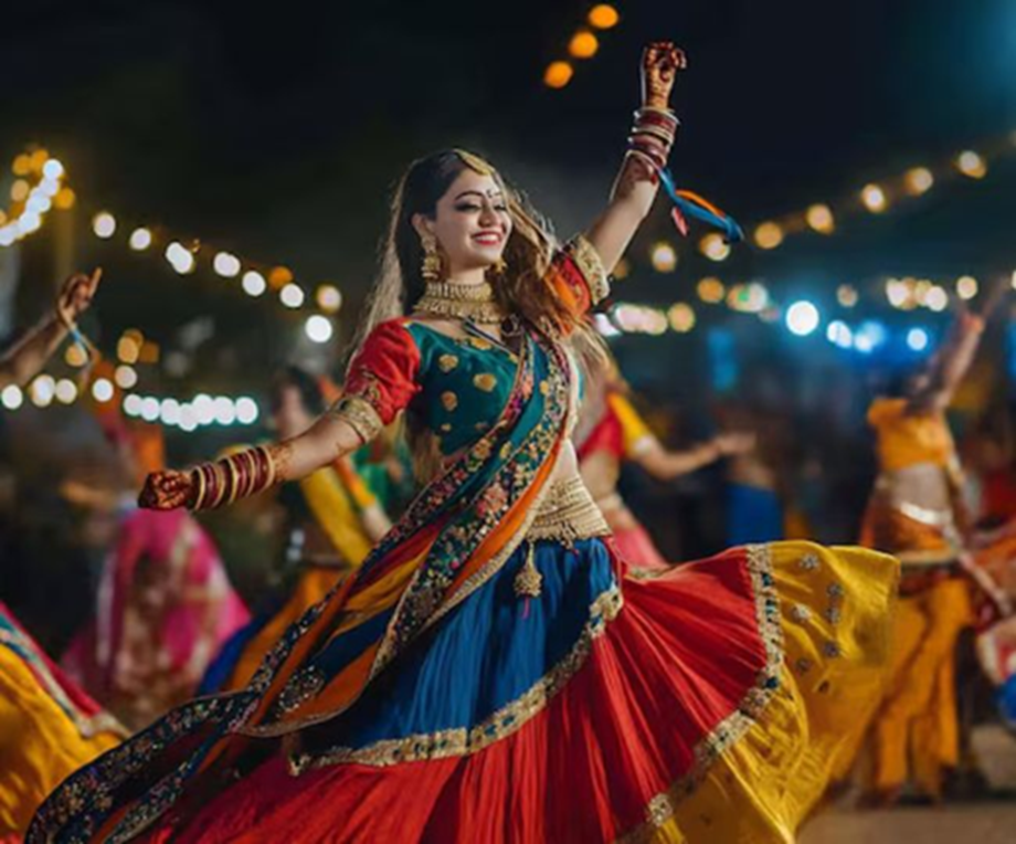 Garba symbolizes the worship of Goddess Shakti, where dancing is performed in a circle. This circle symbolizes the continuous cycle of life and energy. The sound of Dandiya fills the atmosphere with excitement. When thousands of people, dressed in traditional Chaniya-Choli, Kediyu, and Bandhani attire, dance together, the atmosphere becomes divine and joyous.