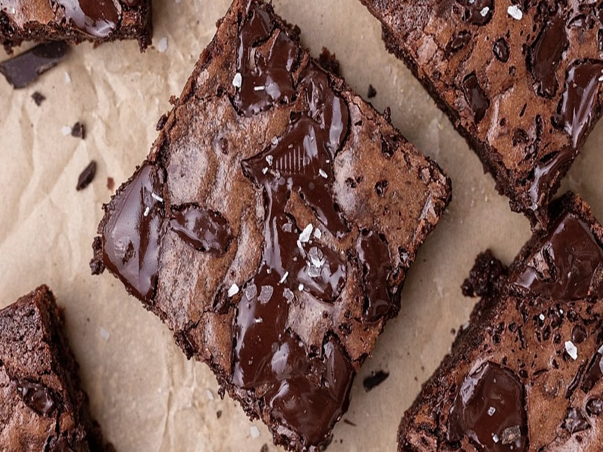 To make the brownies, melt dark chocolate and butter, then add sugar, flour, and eggs.