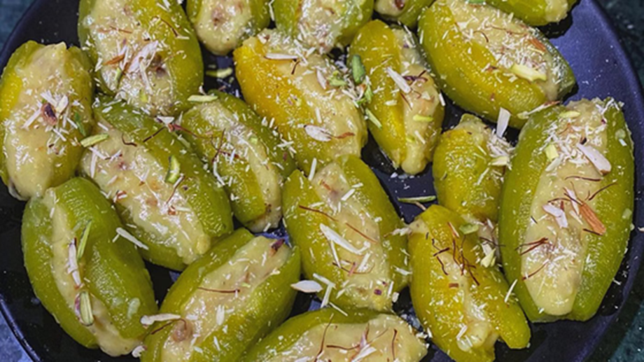 Pointed gourd sweet is very special and unique. To make it, the pointed gourds are lightly boiled. Then they are cooked with sugar and ghee. Khoya (reduced milk solids) and dry fruits are stuffed inside. This sweet is very nutritious and is especially prepared during the winter season.