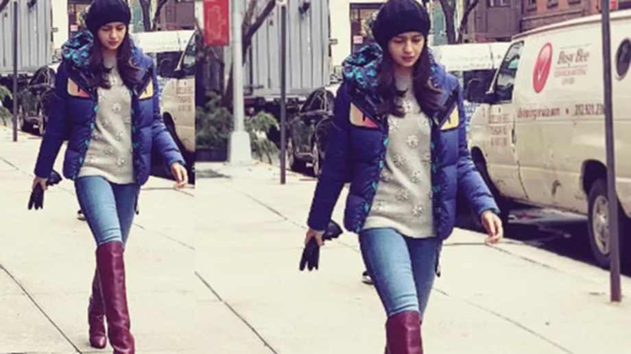 If you want to wear comfortable clothes, follow Alia Bhatt's look. In this, wear fitted jeans with a top and a jacket. Keep your hair open and wear a woolen cap. Replace shoes with high-length boots to make your party look stylish.