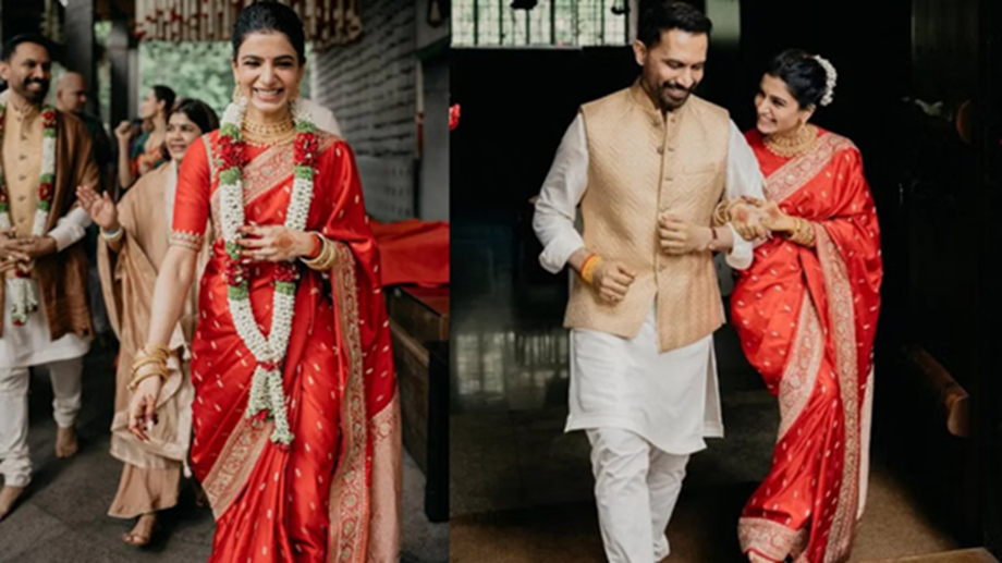 On the first day of the last month of the year, December 1st, Samantha Ruth Prabhu married director Raj Nidimoru. She wore a red and gold saree for the occasion. She styled her hair in a sleek bun and adorned it with a gajra (floral garland). Her gold jewelry made her look even more stunning.