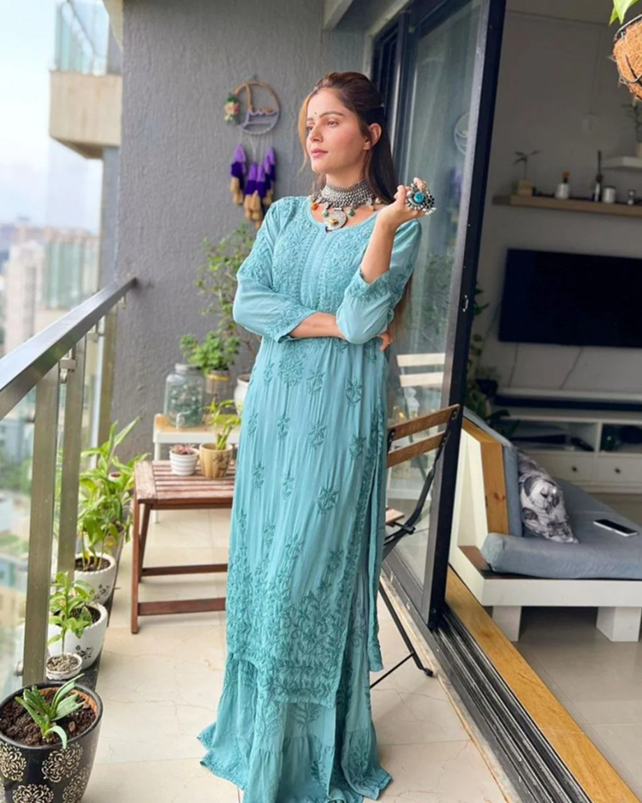 TV actress Rubina Dilaik has a classic collection of Chikankari kurtas. In this, you can match this long full chikankari work kurta with a matching palazzo or skirt. This type of chikankari kurta set gives a wonderful look and also gives relief and comfort from the heat of this season.