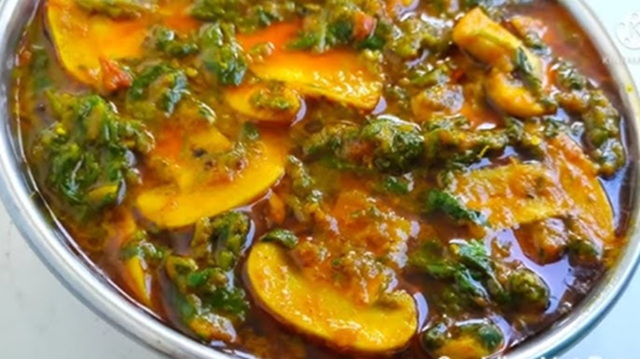Heat 2-3 tablespoons of olive oil or cooking oil in a frying pan. Add the chopped mushrooms and sauté well for 2-3 minutes. Now add the chopped spinach leaves and sauté for a little longer.