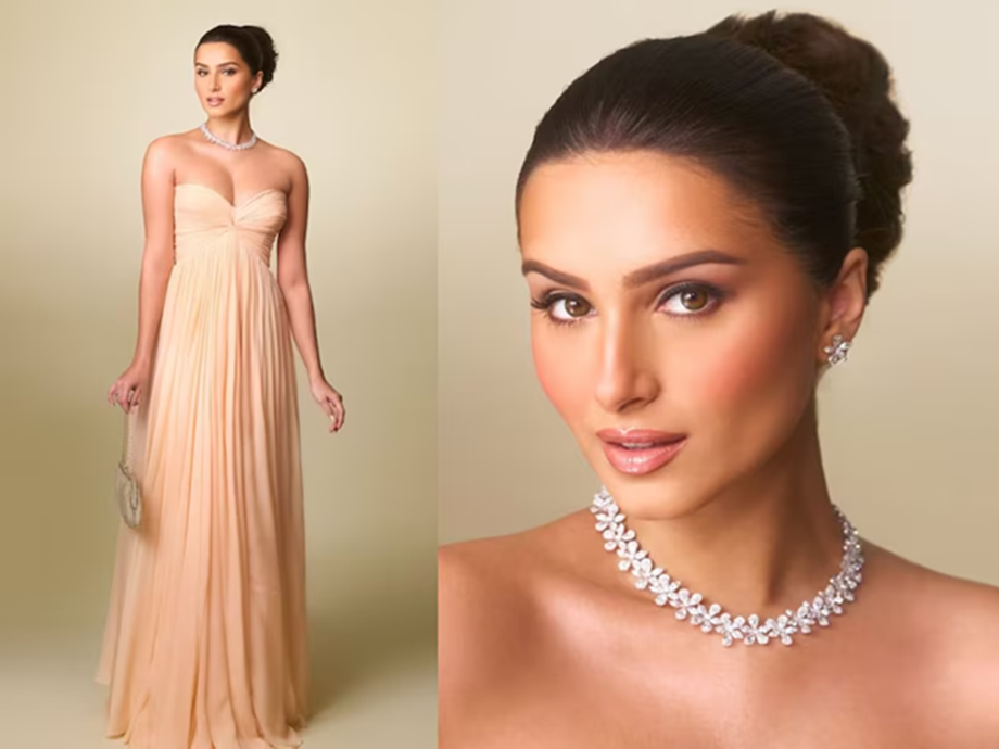 Tara's evening gown is simply stunning. It's very simple and elegant, yet the actress looks incredibly beautiful in it. In this off-shoulder gown, Tara wore a necklace and earrings set and styled her hair in a bun. You can also recreate this type of evening gown for your New Year's Eve party.