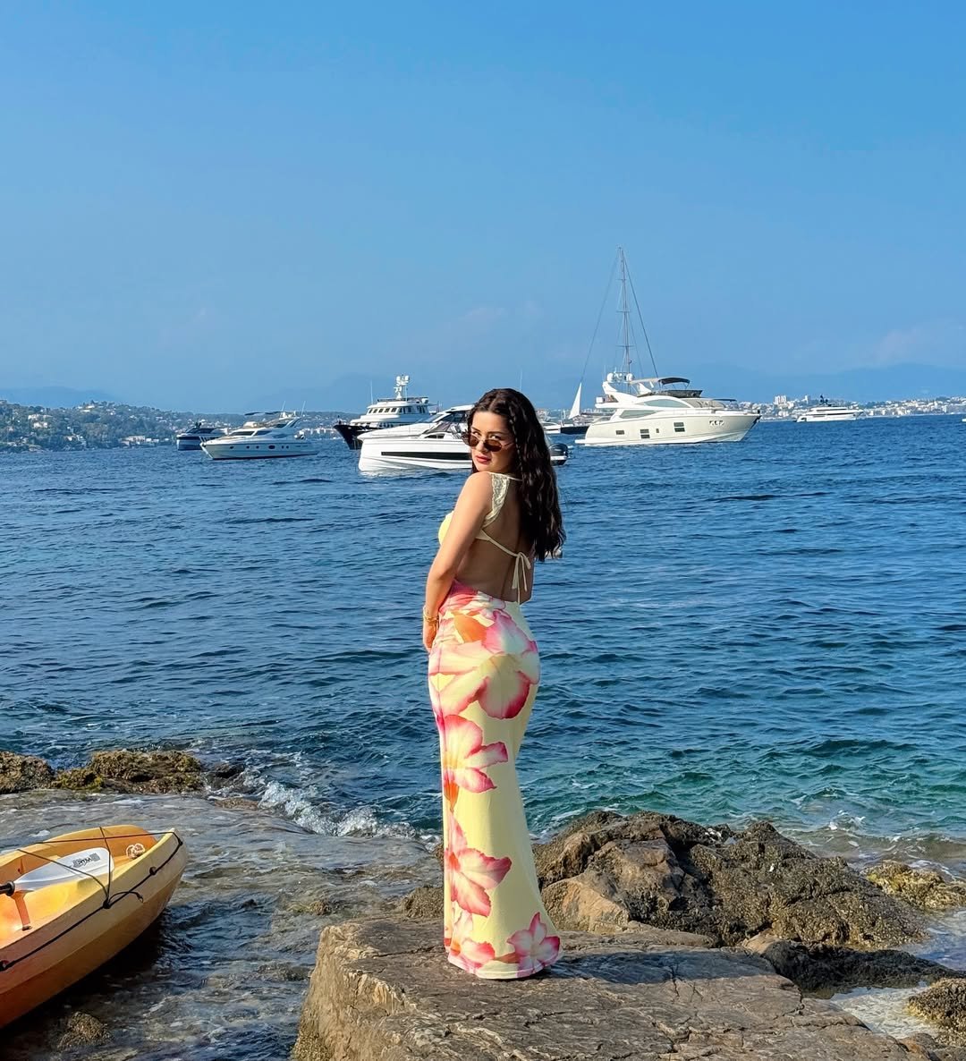 A very beautiful environment is seen in these pictures, in which the blue sea in the background is working to bring contrast to the look of the actress.