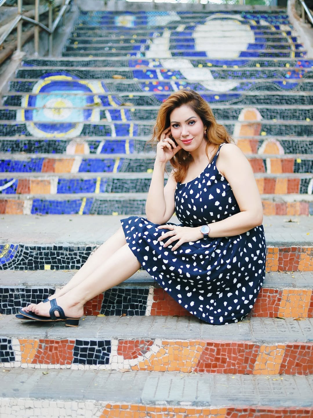 Munmun Dutta has given many beautiful poses while sitting on colorful stairs.