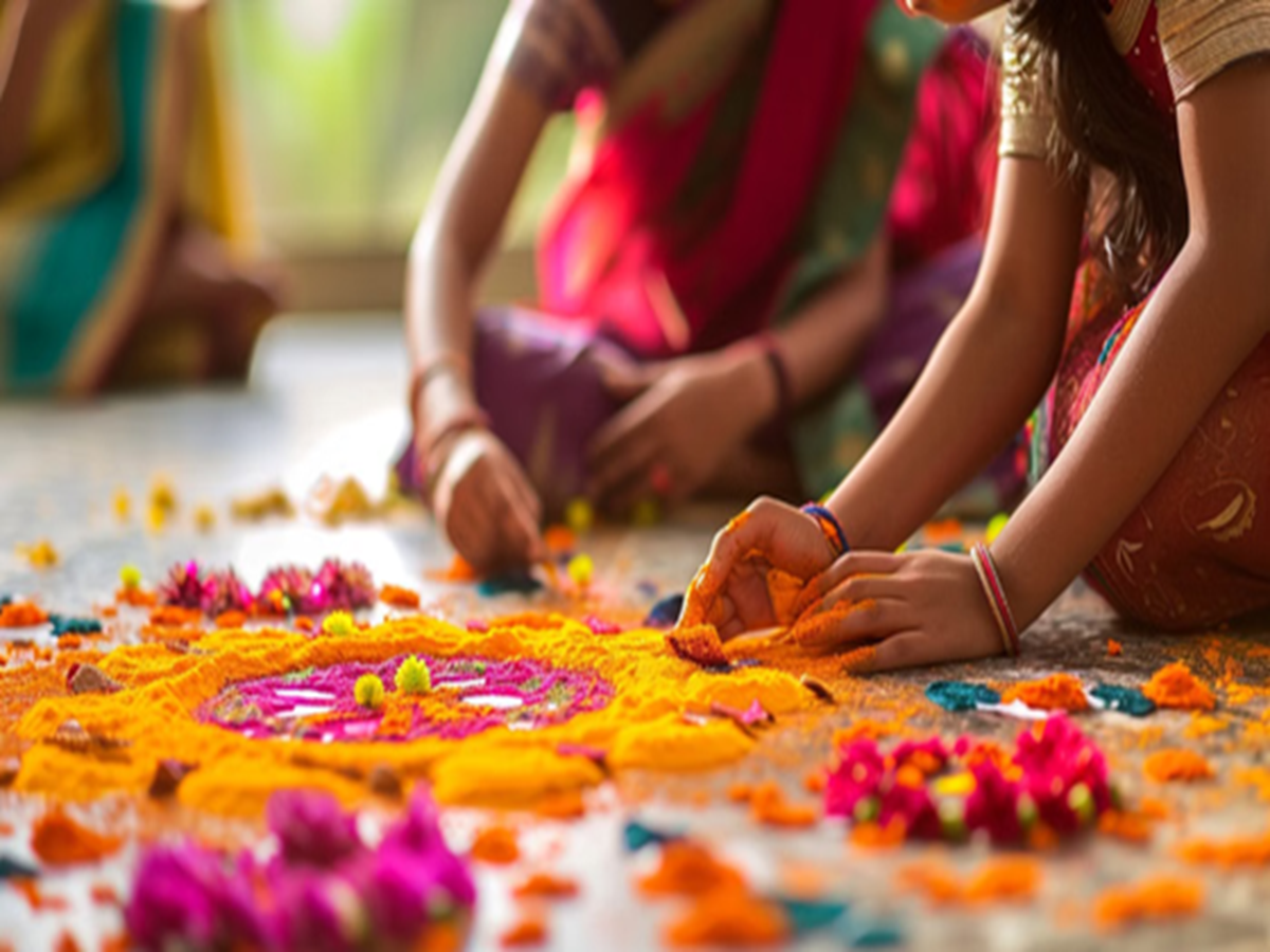 Beautiful Rangolis are created in the courtyard and at the main entrance of the house.