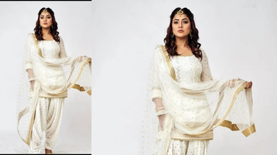If you want to wear something in a light color, take inspiration from Shehnaaz Gill's look. For this, you need to get a white Patiala suit made. If you add golden lace trim to this, your look will be even more stunning. With this type of salwar suit, leave your hair open and styled in curls for a beautiful look.