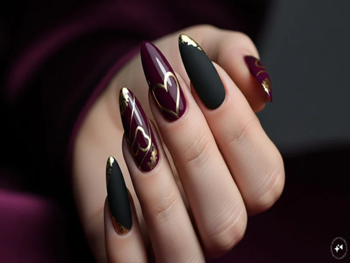 Dark and Moody Romance - Don't like pink and red? Go bold with burgundy, plum, or black nails, then add metallic gold hearts or accents. This is trendy, dramatic, and perfect for those who prefer a non-traditional look for Valentine's Day.