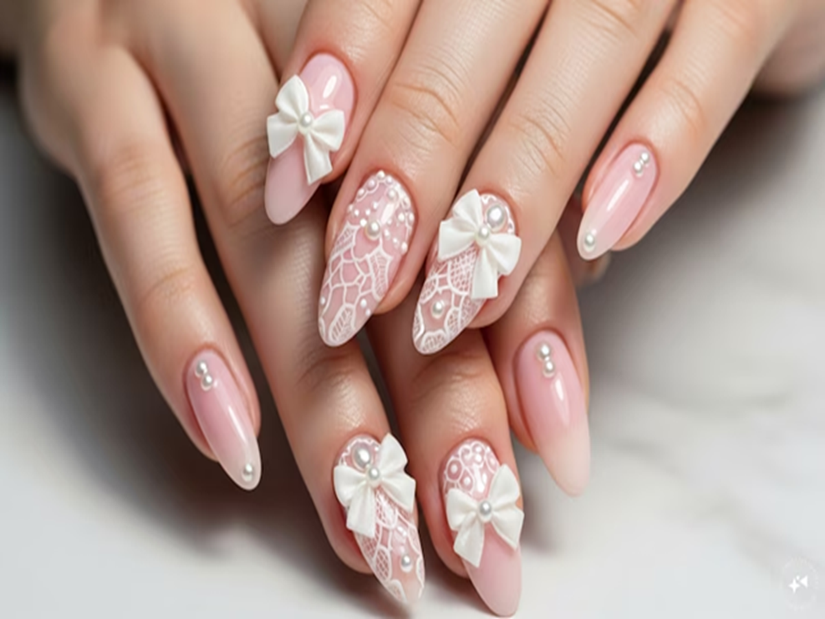 Ribbons and Pearls for a Cute Look - Embrace a playful vibe by adding pretty ribbons, pearls, or lace designs to light pink nails. It's feminine, charming, and Instagram-worthy.