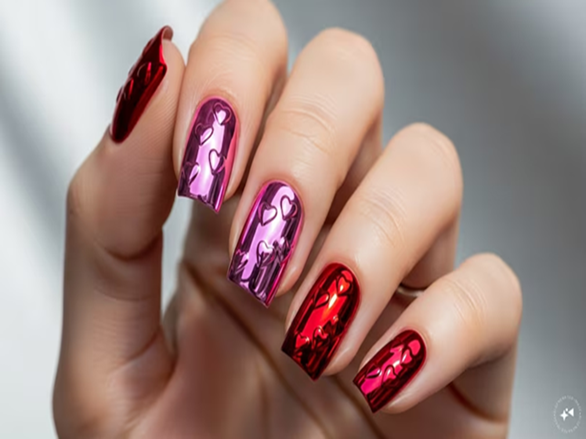 Chrome Love - Chrome nails are trending this season. Try a metallic pink or red chrome finish and add tiny embossed hearts for a futuristic yet romantic look.