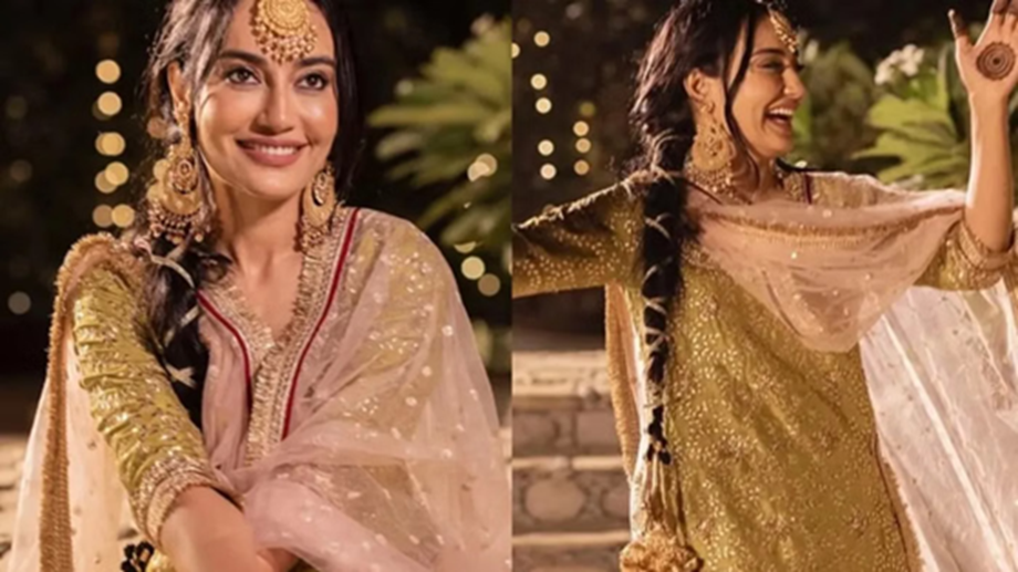 The double braid paranda style reflects the traditional Punjabi Giddha look.