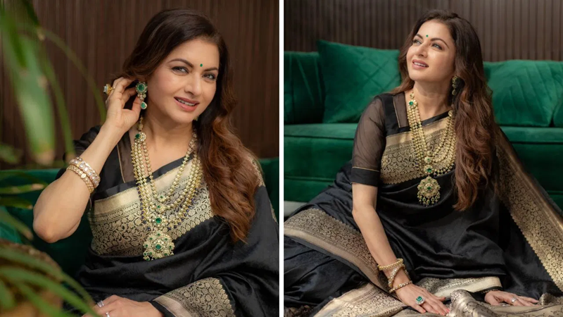 If you are wearing a black color handloom work saree, then carry golden kundan jewellery. Design ideas can be taken from this neckpiece of Bhagyashree. The actress is wearing a beautiful Chandrahaar with kundan work. Its pendant and earrings have green stones.