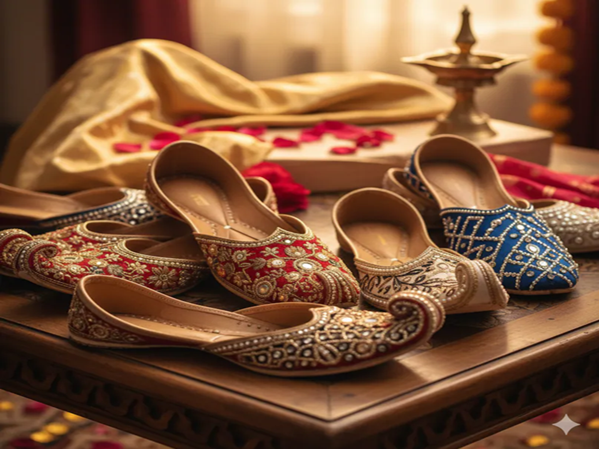 4. Embroidered Juttis/Mojaris/Mules (Traditional Chic)—For weddings or festivals, opt for embroidered juttis or mojaris instead of heavy heels. If you're wearing Indo-Western, stylish mules are a great option.