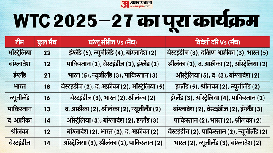 The Australian team will play a maximum of 22 Test matches in the World Test Championship 2025-27 cycle. At the same time, the England team will play 21 matches. After this, India is in third place with 18 matches. New Zealand has to play 16 and South Africa-West Indies have to play 14-14 Tests. Pakistan team has to play 13 and Sri Lanka-Bangladesh have to play 12-12 Tests. Apart from Sri Lanka, Bangladesh, India, and England, the Australian team will start its campaign in this cycle with a three-match Test series against the West Indies. It is going to start on June 25. At the same time, the champion South Africa team will start its 2025-27 WTC cycle with a two-match Test series against Pakistan in October. Due to fewer Test matches, there is a lot of gap between South Africa's two-Test series.