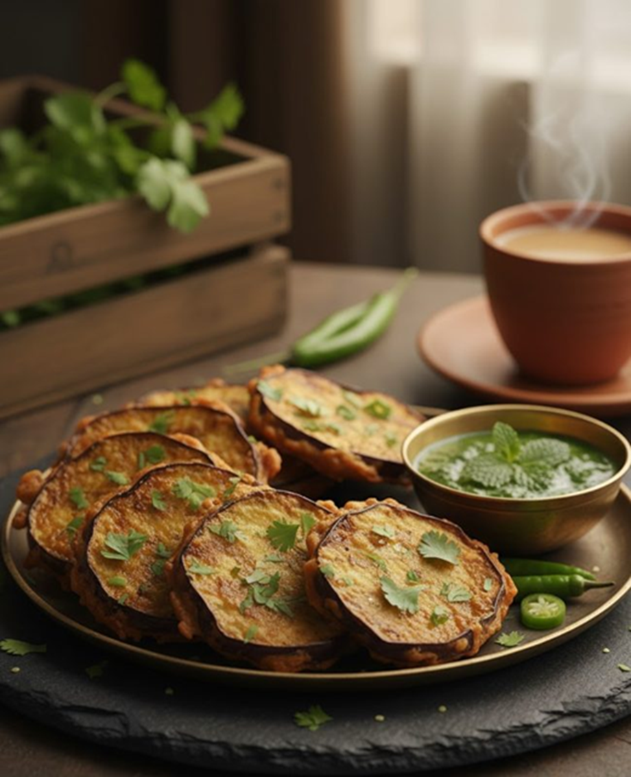 Thin slices of eggplant are dipped in a spiced gram flour batter and fried crisply. It tastes great with both khichdi and tea.