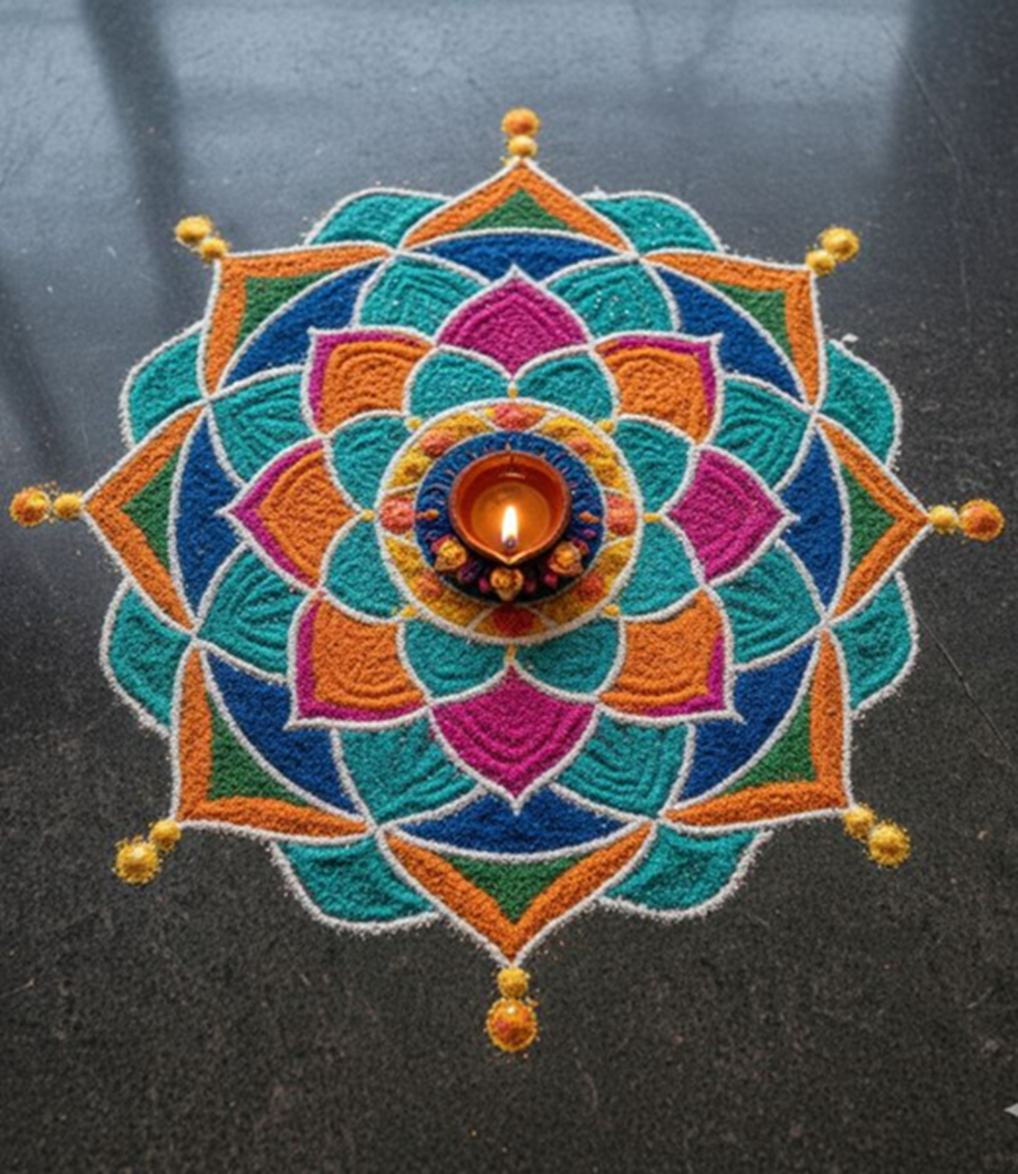 Both the diya and the peacock symbolize auspiciousness and beauty. A rangoli made with both of them looks very attractive.