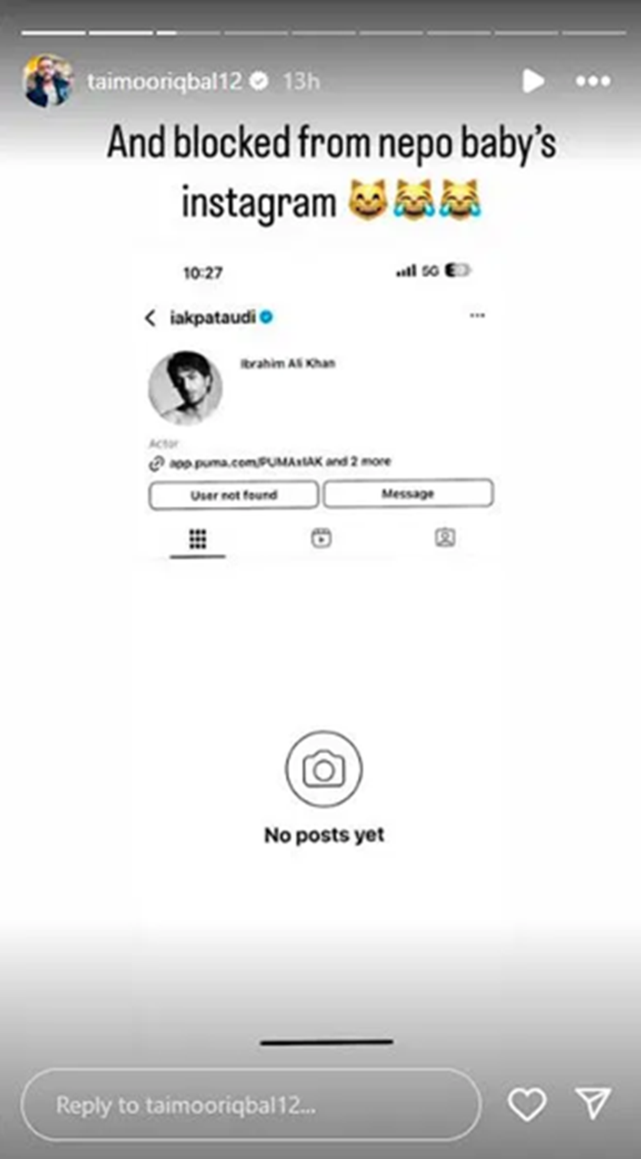 Responding to Ibrahim's comment, Taimur wrote, "Hahaha look this is the guy. This is the guy I want to see in the movie. Not that fake cornetto mushy cringy person. But oh yes, the nose surgery comment was bad. Rest I completely accept. A huge fan of your father. Don't disappoint him." However, it is not known what the critic said to Ibrahim. The critic also shared on his Instagram story that Ibrahim has blocked him on Instagram as well.