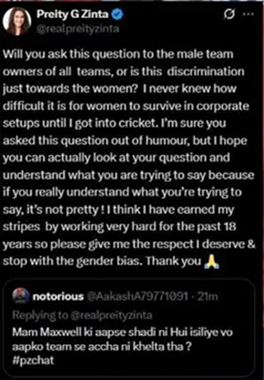Preity said- Will you ask this question to the male team owners of all the teams, or is this discrimination only towards women? I never knew how difficult it is for women to survive in a corporate setup until I got into cricket. I'm sure you asked this question jokingly, but I hope you can look at your question and understand what you're trying to say, because if you understand what you're trying to say, it's not good! I think I've worked very hard for the last 18 years to get where I am, so please give me the respect I deserve and stop being gender biased. Thank you.